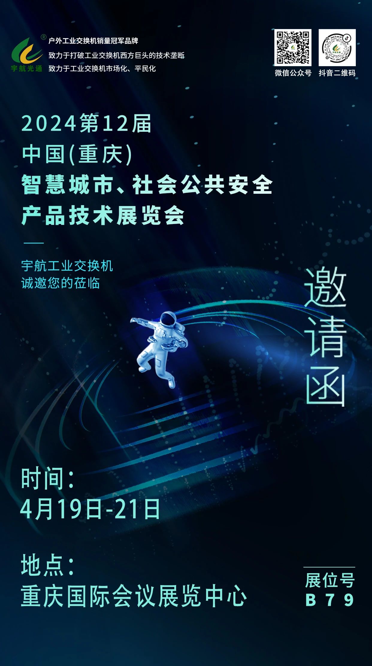 4月10-4月13日,宇航工業交換機相繼參加了2024亞洲國際交通技術與工程設施展覽會、第十四屆中國國際道路交通安全產品博覽會暨公安交警警用裝備展、2024重慶國際智慧電力與電氣設備展覽會以及第24屆湖南智慧安防產品及警用裝備博覽會,為宇航在智慧交通、智慧電力以及智慧安防等領域搭建了交流合作的廣闊平臺。