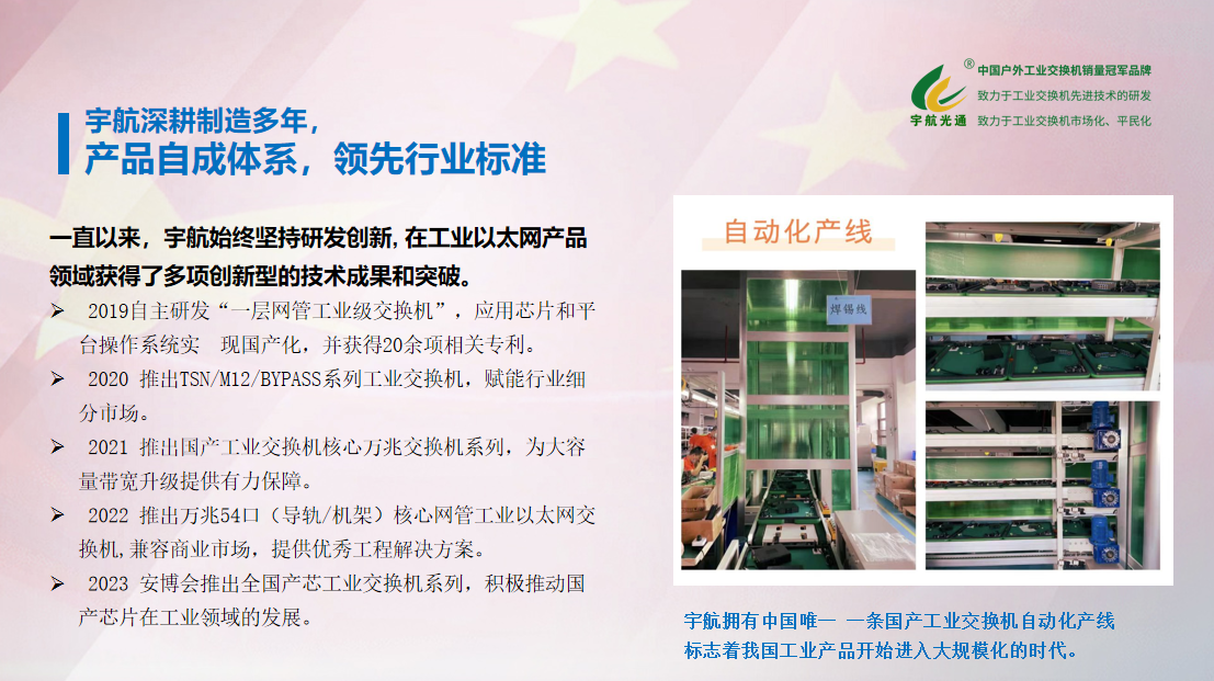 宇航作為一家專注于工業以太網交換機研發、生產、銷售和服務于一體的國家專精特新小巨人企業、國家高新技術企業,我們深知自身的成長與發展離不開祖國的繁榮與昌盛。多年來,我們始終秉承“創新驅動,質量為本”的理念,為客戶提供高性能、高穩定性的工業交換機產品,以實際行動為祖國的建設貢獻力量。工業交換機作為現代工業通信的重要組成部分,承擔著數據傳輸、信息交換等關鍵任務,也在智能制造、智慧城市、新能源等領域發揮著舉足輕重的作用。宇航始終緊跟時代步伐,不斷創新技術,提升產品品質,以滿足日益增長的市場需求。