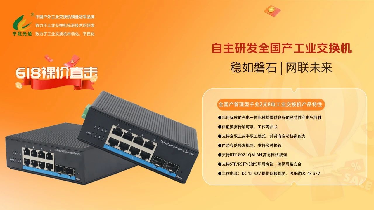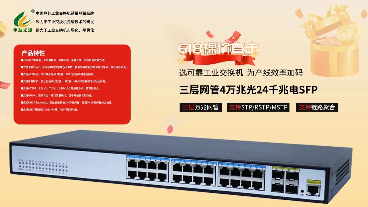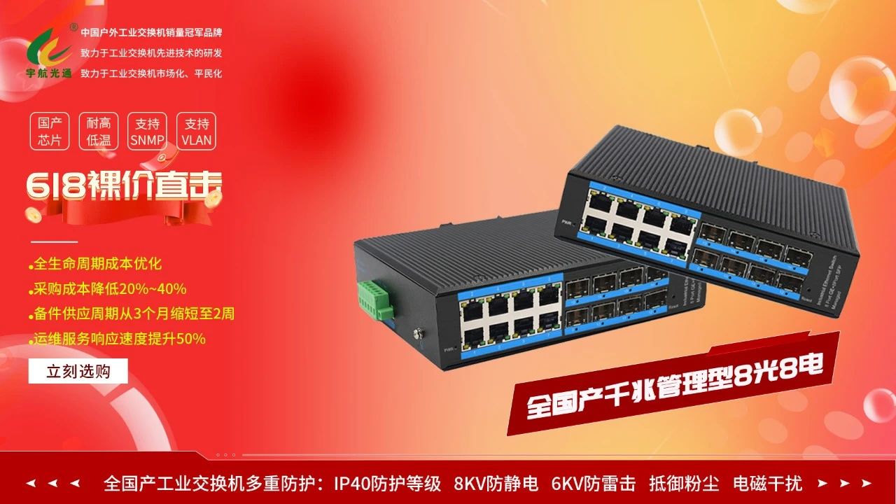 值此618之際,為回饋廣大客戶長期以來的支持與信賴,宇航特別推出三款爆款工業交換機裸價直供,品質不變,價格直降!經過嚴苛的環境測試,可在-40℃至80℃的極端溫度下穩定運行。我們承諾:所有產品保持原廠品質不變,價格直降到底!更提供行業領先的3-5年超長質保,24小時快速響應服務,讓您買得放心、用得安心。