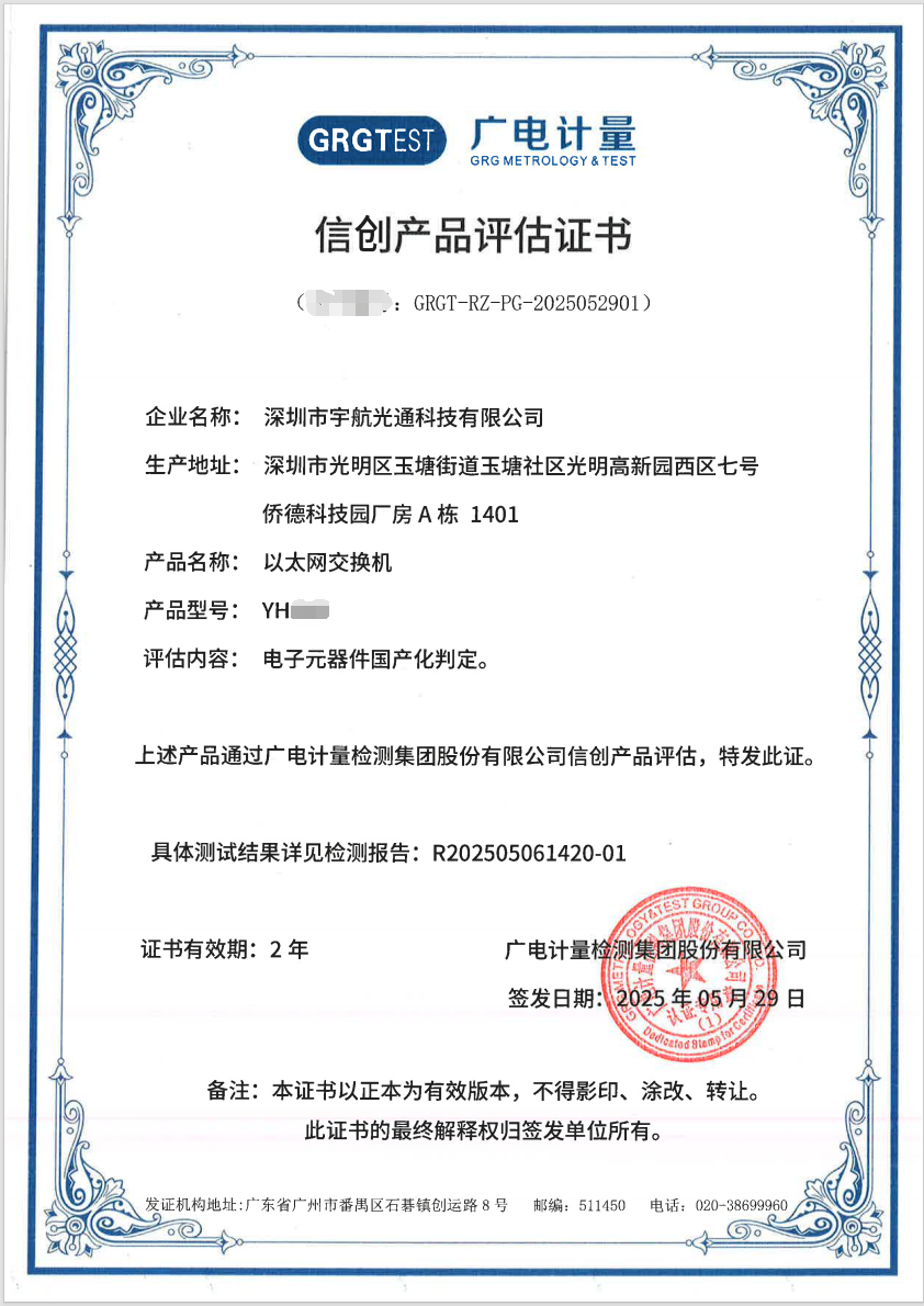 在工業4.0和智能制造加速發展的今天,宇航持續加大研發投入,先后獲得200余項技術專利,全面通過ISO9001、ISO14001、ISO45001、CQC,公安部、工信部等多項認證,工業交換機行業唯一獲得“國貨之光”榮譽,有幸被《人民日報》、CCTV、新華社等國家權威媒體報道和推薦。同時也完成了高低溫、防雷、靜電、鹽霧和振動等嚴苛環境測試,宇航全國產化系列工業交換機產品更是獲得國家信創認證,為關鍵基礎設施領域提供了安全可靠的通信保障。