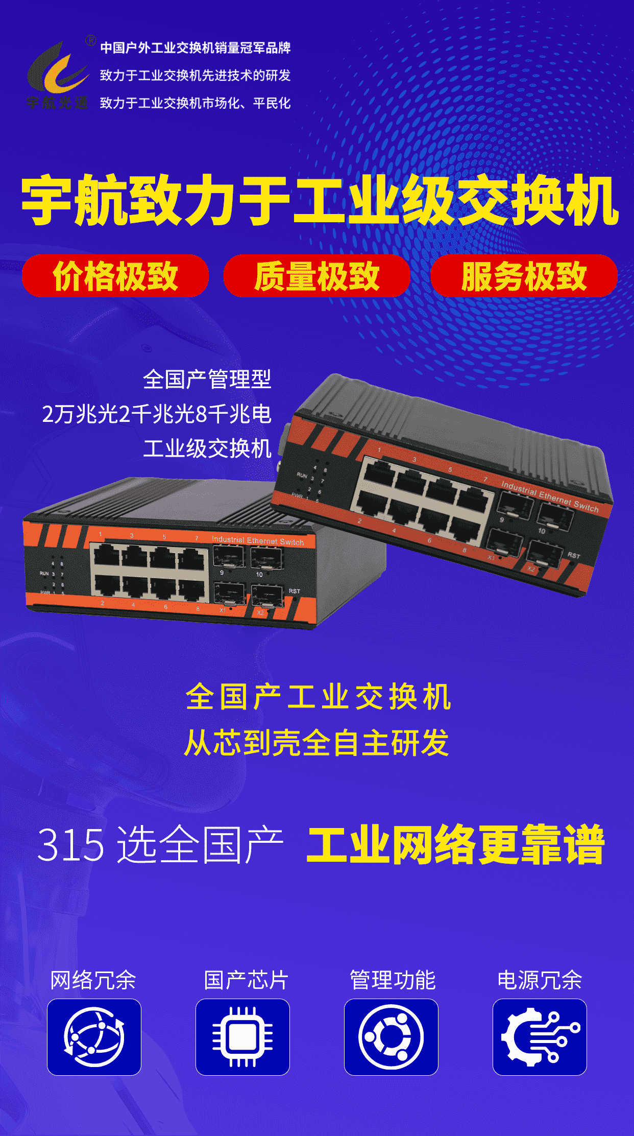 宇航工業(yè)交換機(jī)用14年時(shí)間持續(xù)證明:國(guó)產(chǎn)工業(yè)交換機(jī)同樣可以做到—“價(jià)格極致、質(zhì)量極致、服務(wù)極致”。作為國(guó)產(chǎn)工業(yè)交換機(jī)最大的源頭廠商、全國(guó)產(chǎn)工業(yè)交換機(jī)發(fā)起單位和中國(guó)信創(chuàng)產(chǎn)業(yè)500強(qiáng),宇航用"三個(gè)極致",向每一位消費(fèi)者致敬!