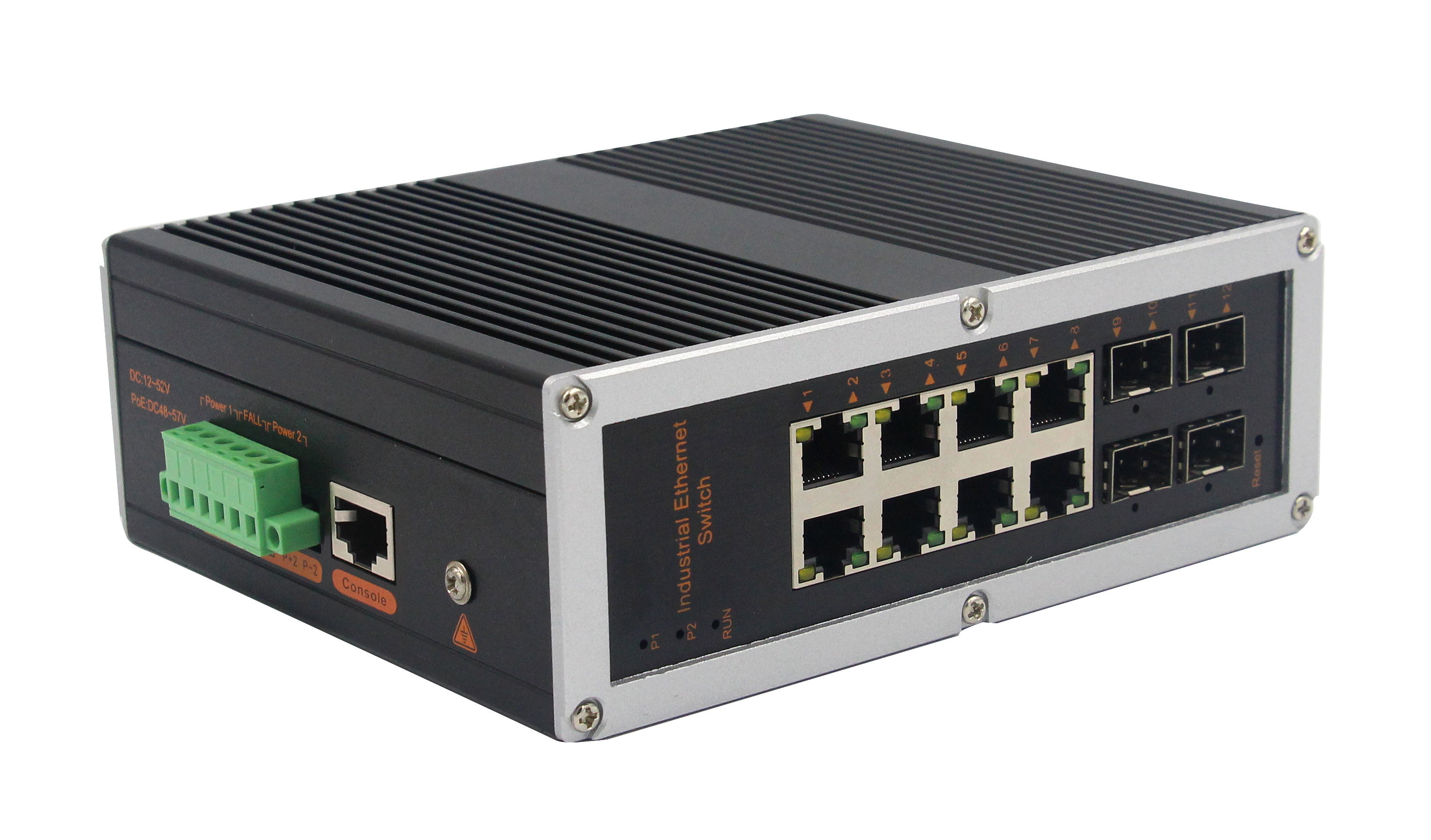 4個千兆光+8個千兆電、SFP接口(不含光模塊)、導軌式、DC12-52V供電 |