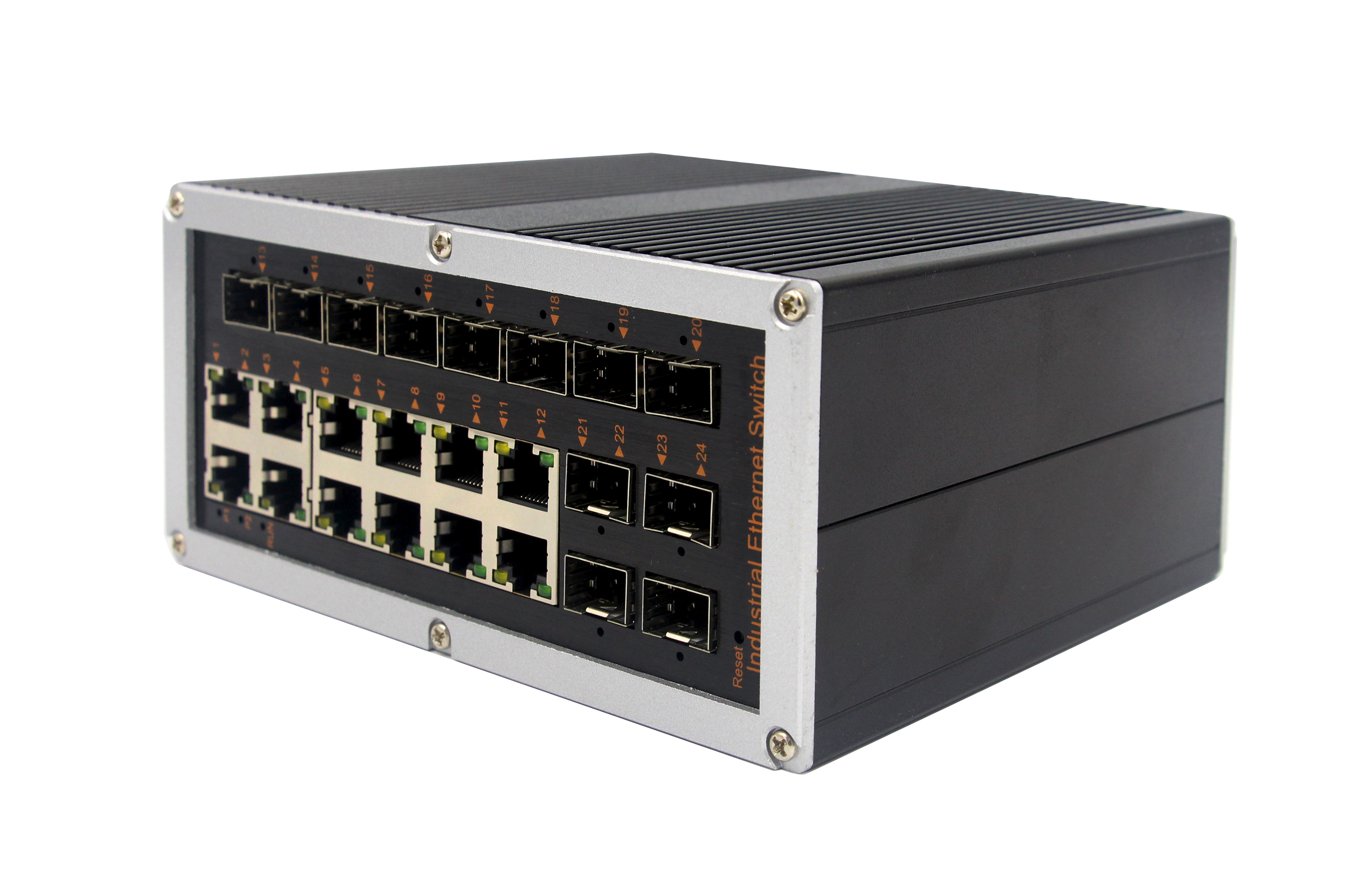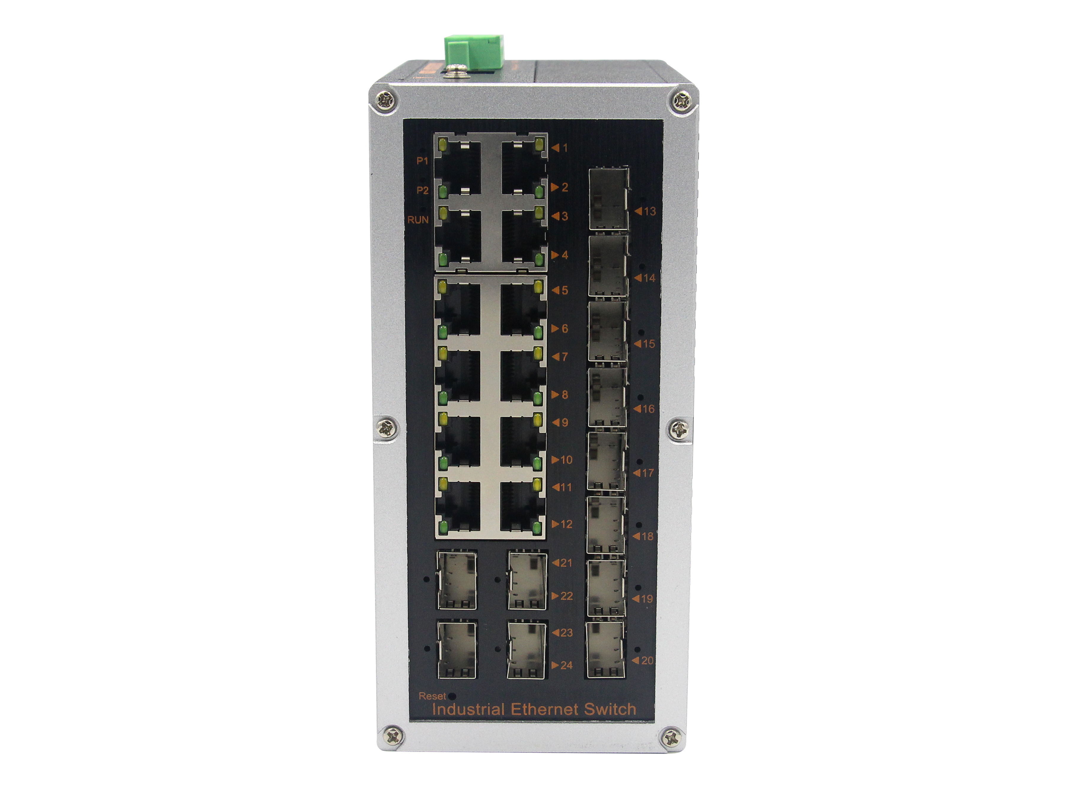 網管型千兆12光12電YH600-1212BGS-SFP工業以太網交換機,產品符合FCC、CE、ROHS標準。支持4個千兆光口和20個千兆電口,支持一路console口;支持工業現場所需的以太網二層協議,保證通信網絡的穩定性;該系列交換機采用低功耗、無風扇設計,確保無噪聲干擾,同時支持-40~85℃工作溫度和良好的EMC電磁兼容性能,保證在惡劣的工業環境中保持穩定的工作,為工廠自動化,智能交通,視頻監控等工業應用領域組建快速穩定的網絡終端接入網絡提供安全可靠的解決方案。護等級的外殼及 LED 指示燈,使之成為一個即插即用的工業級設備,為用戶的以太網設備聯網提供可靠、便捷的解決方案。