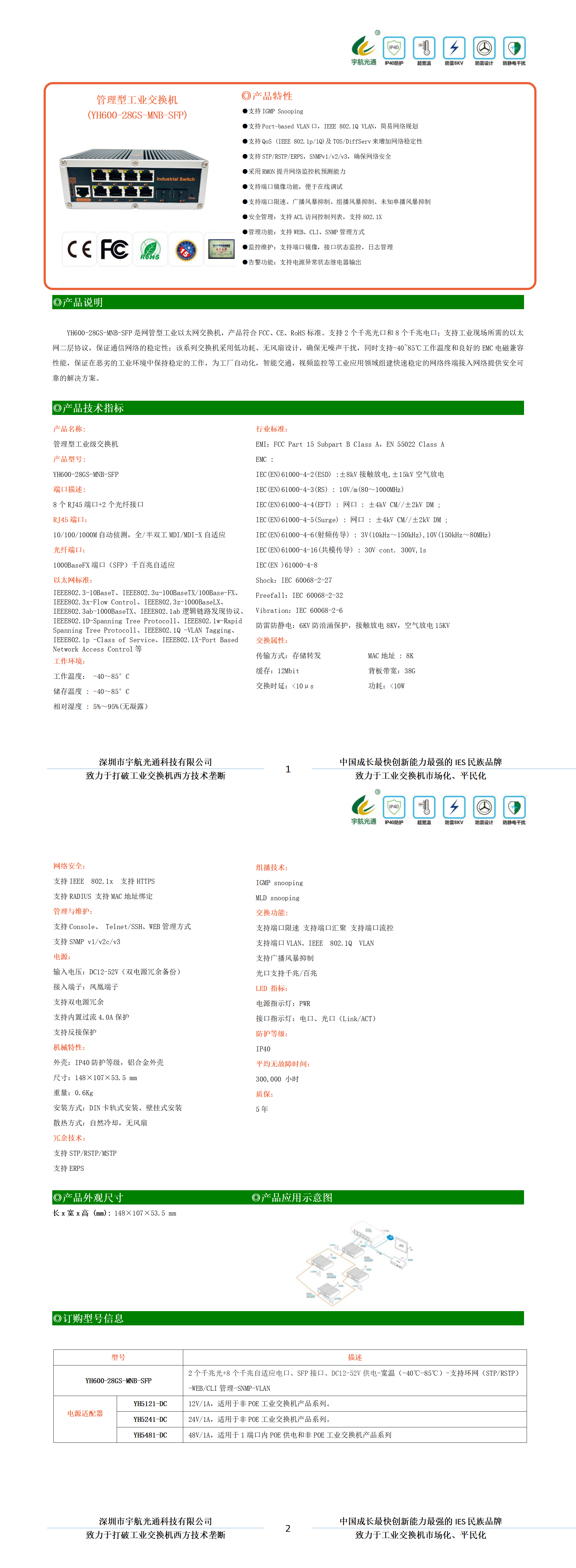 YH600-28GS-MNB-SFP是網管型工業以太網交換機,產品符合FCC、CE、RoHS標準。支持2個千兆光口和8個千兆電口;支持工業現場所需的以太網二層協議,保證通信網絡的穩定性;該系列交換機采用低功耗、無風扇設計,確保無噪聲干擾,同時支持-40~85℃工作溫度和良好的EMC電磁兼容性能,保證在惡劣的工業環境中保持穩定的工作,為工廠自動化,智能交通,視頻監控等工業應用領域組建快速穩定的網絡終端接入網絡提供安全可靠的解決方案。