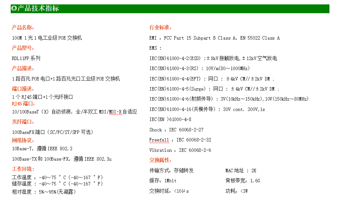 1路百兆POE電口+1路百兆SC光口工業級以太網POE交換機,支持1個10/100Base-TX電口和1個100Base-X光口。產品符合FCC、CE、ROHS標準。RD11FP系列交換機具有-40℃~80℃的工作溫度,具有超強的堅固度能適應各種嚴苛環境,也可以非常方便的安置在空間緊湊的控制箱中。導軌的安裝特性、寬溫操作及擁有IP40防護等級的外殼及LED指示燈,使RD11FP成為一個即插即用的工業級設備,為用戶的以太網設備聯網提供可靠、便捷的解決方案。