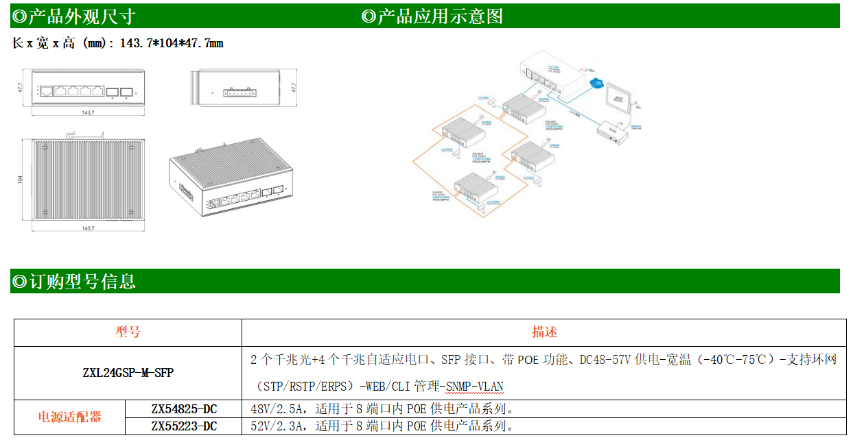 ZXL24GSP-M-SFP是網(wǎng)管型工業(yè)以太網(wǎng)POE交換機(jī),產(chǎn)品符合FCC、CE、RoHS標(biāo)準(zhǔn)。支持2個(gè)千兆光口和4個(gè)千兆電口;支持工業(yè)現(xiàn)場(chǎng)所需的以太網(wǎng)二層協(xié)議,保證通信網(wǎng)絡(luò)的穩(wěn)定性;該系列交換機(jī)采用低功耗、無(wú)風(fēng)扇設(shè)計(jì),確保無(wú)噪聲干擾,同時(shí)支持-40~75℃工作溫度和良好的EMC電磁兼容性能,保證在惡劣的工業(yè)環(huán)境中保持穩(wěn)定的工作,為工廠自動(dòng)化,智能交通,視頻監(jiān)控等工業(yè)應(yīng)用領(lǐng)域組建快速穩(wěn)定的網(wǎng)絡(luò)終端接入網(wǎng)絡(luò)提供安全可靠的解決方案。