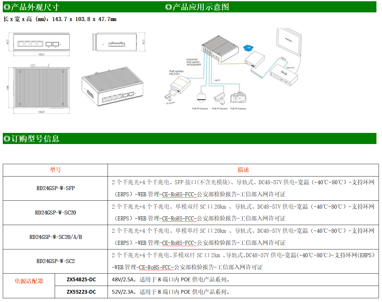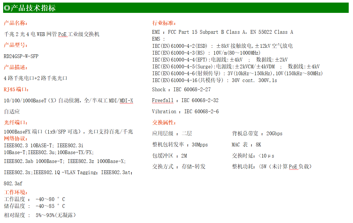 RD24GSP-W系列WEB管理工業(yè)級(jí)以太網(wǎng)PoE交換機(jī),產(chǎn)品符合FCC、CE、ROHS標(biāo)準(zhǔn),支持工業(yè)現(xiàn)場(chǎng)所需的以太網(wǎng)二層協(xié)議,保證通信網(wǎng)絡(luò)的穩(wěn)定性。該系列交換機(jī)采用低功耗、無風(fēng)扇設(shè)計(jì),確保無噪聲干擾,同時(shí)支持-40~80℃工作溫度和良好的EMC電磁兼容性能,保證在惡劣的工業(yè)環(huán)境中保持穩(wěn)定的工作,為工廠自動(dòng)化,智能交通,視頻監(jiān)控等工業(yè)應(yīng)用領(lǐng)域組建快速穩(wěn)定的網(wǎng)絡(luò)終端接入網(wǎng)絡(luò)提供安全可靠的解決方案。