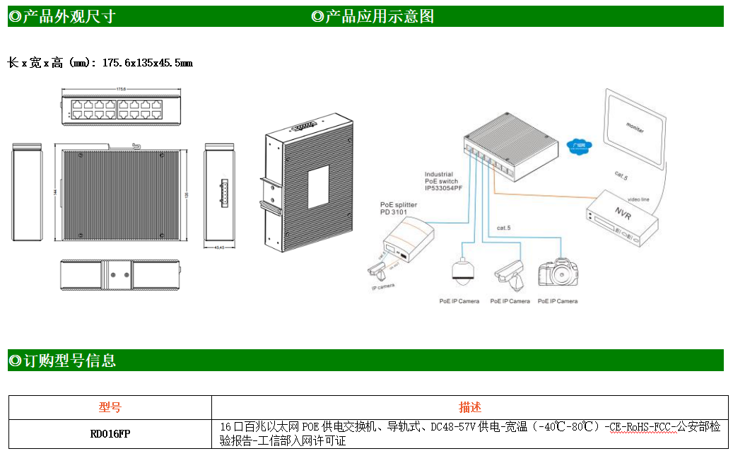 16路百兆電口工業級以太網交換機,支持16個10Base-T/100Base-TX POE電口。產品符合FCC、CE、ROHS標準。ZXR016FP交換機具有-40℃~80℃的工作溫度,具有超強的堅固度能適應各種嚴苛環境,也可以非常方便的安置在空間緊湊的控制箱中。導軌的安裝特性、寬溫操作及擁有IP40防護等級的外殼及LED指示燈,使ZXR016FP成為一個即插即用的工業級設備,為用戶的以太網設備聯網提供可靠、便捷的解決方案。