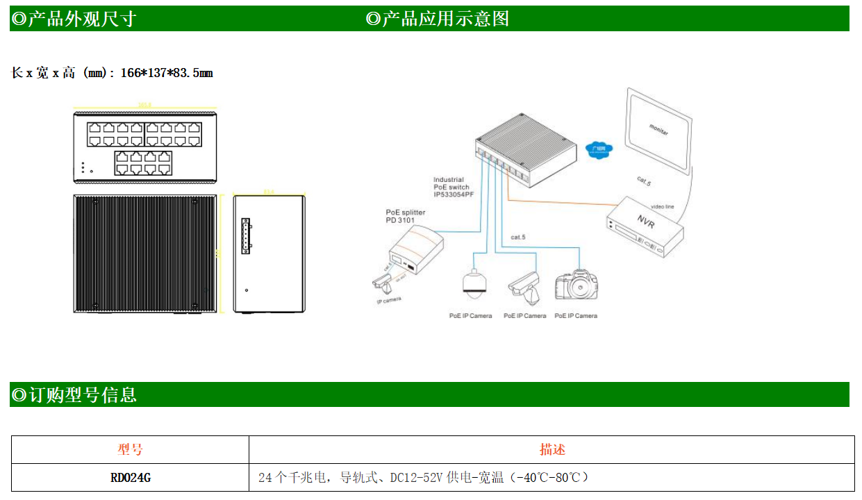 24路千兆電口工業(yè)級以太網(wǎng)交換機,支持24個10Base-T/100Base-T/1000Base-TX電口。產(chǎn)品符合FCC、CE、ROHS標準。RD024G交換機具有-40℃~80℃的工作溫度,具有超強的堅固度能適應(yīng)各種嚴苛環(huán)境,也可以非常方便的安置在空間緊湊的控制箱中。機架式安裝特性、寬溫操作及擁有IP40防護等級的外殼及LED指示燈,使RD224G-SFP成為一個即插即用的工業(yè)級設(shè)備,為用戶的以太網(wǎng)設(shè)備聯(lián)網(wǎng)提供可靠、便捷的解決方案。