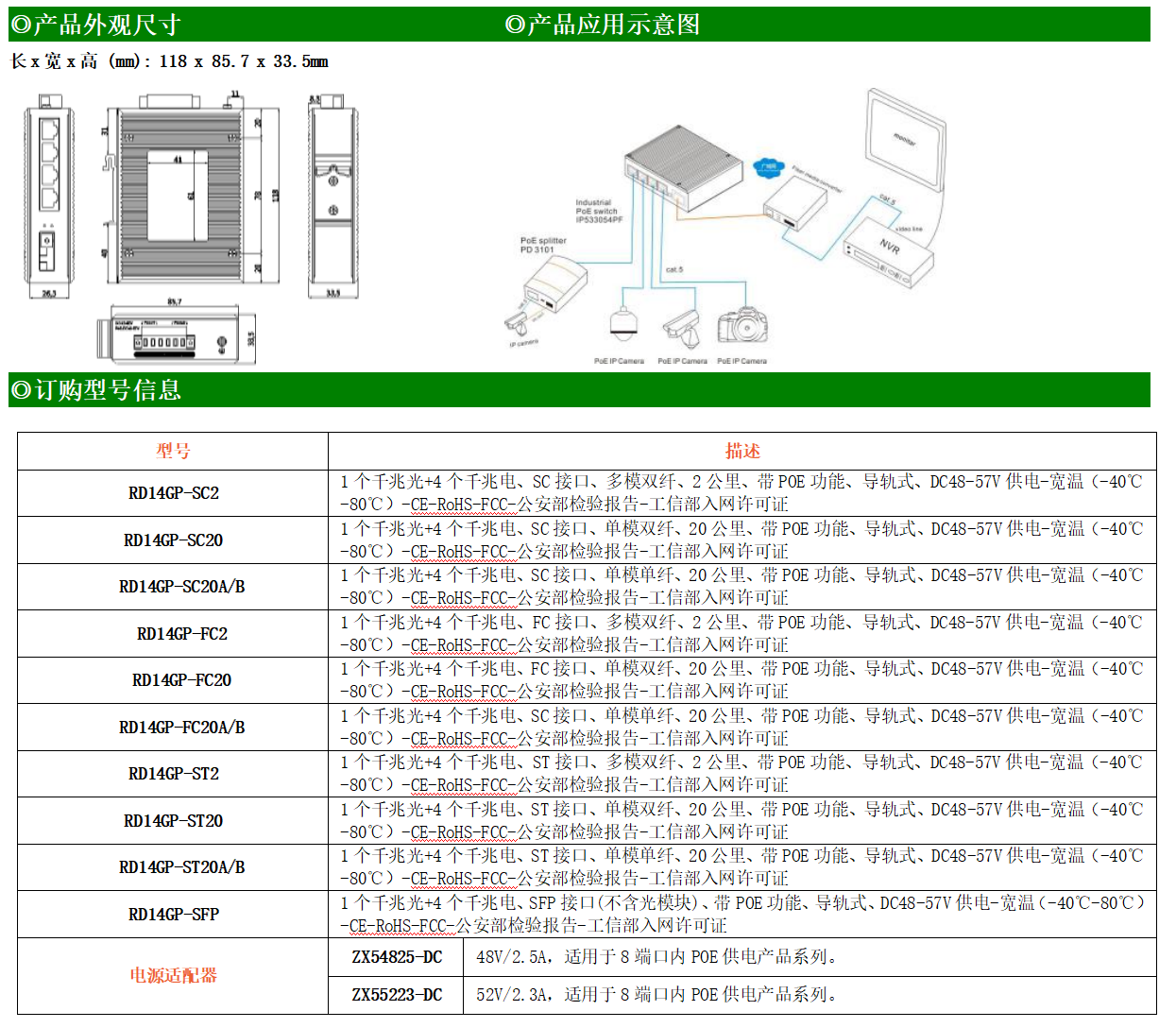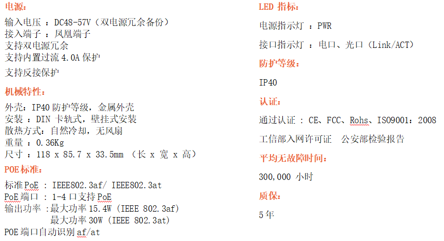 4路千兆POE電口+1路千兆FX光口工業(yè)級(jí)以太網(wǎng)POE交換機(jī),支持4個(gè)10/100/1000Base-TX電口和1個(gè)1000Base-X光口。產(chǎn)品符合FCC、CE、ROHS標(biāo)準(zhǔn)。RD14GP系列交換機(jī)具有-40℃~80℃的工作溫度,具有超強(qiáng)的堅(jiān)固度能適應(yīng)各種嚴(yán)苛環(huán)境,也可以非常方便的安置在空間緊湊的控制箱中。導(dǎo)軌的安裝特性、寬溫操作及擁有IP40防護(hù)等級(jí)的外殼及LED指示燈,使RD14GP成為一個(gè)即插即用的工業(yè)級(jí)設(shè)備,為用戶的以太網(wǎng)設(shè)備聯(lián)網(wǎng)提供可靠、便捷的解決方案。