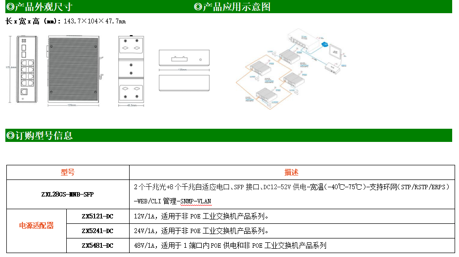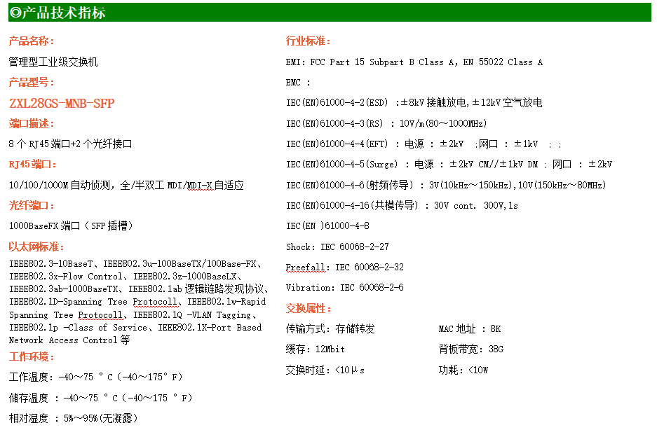 ZXL28GS-MNB-SFP是網(wǎng)管型工業(yè)以太網(wǎng)交換機(jī),產(chǎn)品符合FCC、CE、RoHS標(biāo)準(zhǔn)。支持2個(gè)千兆光口和8個(gè)千兆電口;支持工業(yè)現(xiàn)場所需的以太網(wǎng)二層協(xié)議,保證通信網(wǎng)絡(luò)的穩(wěn)定性;該系列交換機(jī)采用低功耗、無風(fēng)扇設(shè)計(jì),確保無噪聲干擾,同時(shí)支持-40~75℃工作溫度和良好的EMC電磁兼容性能,保證在惡劣的工業(yè)環(huán)境中保持穩(wěn)定的工作,為工廠自動(dòng)化,智能交通,視頻監(jiān)控等工業(yè)應(yīng)用領(lǐng)域組建快速穩(wěn)定的網(wǎng)絡(luò)終端接入網(wǎng)絡(luò)提供安全可靠的解決方案。