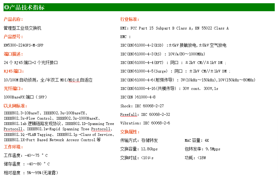 KW5300-224GFS-M是網管型工業以太網交換機,產品符合FCC、CE、RoHS標準。支持2個千兆光口和24個百兆電口;支持工業現場所需的以太網二層協議,保證通信網絡的穩定性;該系列交換機采用低功耗、無風扇設計,確保無噪聲干擾,同時支持-40~75℃工作溫度和良好的EMC電磁兼容性能,保證在惡劣的工業環境中保持穩定的工作,為工廠自動化,智能交通,視頻監控等工業應用領域組建快速穩定的網絡終端接入網絡提供安全可靠的解決方案。