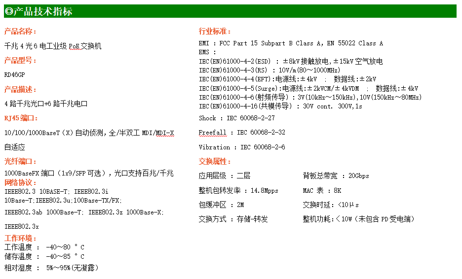 RD46GP系列工業(yè)級以太網(wǎng)交換機(jī),提供4個(gè)千兆光口+6個(gè)千兆電口,支持4路PoE,產(chǎn)品符合FCC、CE、ROHS標(biāo)準(zhǔn),支持工業(yè)現(xiàn)場所需的以太網(wǎng)協(xié)議,保證通信網(wǎng)絡(luò)的穩(wěn)定性。該系列交換機(jī)采用低功耗、無風(fēng)扇設(shè)計(jì),確保無噪聲干擾,同時(shí)支持-40~80℃工作溫度和良好的EMC電磁兼容性能,保證在惡劣的工業(yè)環(huán)境中保持穩(wěn)定的工作,為工廠自動化,智能交通,視頻監(jiān)控等工業(yè)應(yīng)用領(lǐng)域組建快速穩(wěn)定的網(wǎng)絡(luò)終端接入網(wǎng)絡(luò)提供安全可靠的解決方案。
