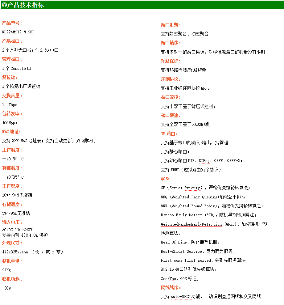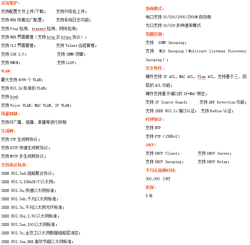 ●網(wǎng)絡(luò)冗余:支持STP/RSTP/MSTP,支持ERPS(自愈時間<20ms)