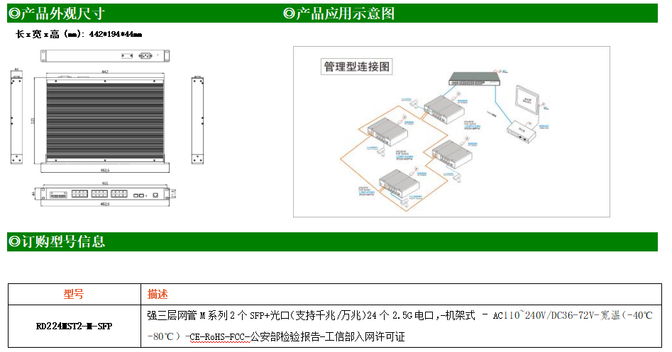 RD224MST2-M-SFP交換機(jī)是我司推出的一款萬兆三層交換機(jī),配備2個萬兆SFP+光口和24個10/100/1000/2500M Base-T自適應(yīng)電口,具備先進(jìn)的硬件處理能力和最豐富的業(yè)務(wù)特性。支持IPv4/IPv6 硬件雙棧及線速轉(zhuǎn)發(fā),使客戶能夠從容應(yīng)對即將帶來的IPv6 時代其提供高容量的交換能力。RD224MST2-M-SFP交換機(jī)具有-40℃~80℃的工作溫度,具有超強(qiáng)的堅(jiān)固度能適應(yīng)各種嚴(yán)苛環(huán)境。導(dǎo)軌式安裝特性、寬溫操作,使RD224MST2-M-SFP的交換機(jī)成為一個即插即用的工業(yè)級設(shè)備,為用戶的以太網(wǎng)設(shè)備聯(lián)網(wǎng)提供可靠、便捷的解決方案。