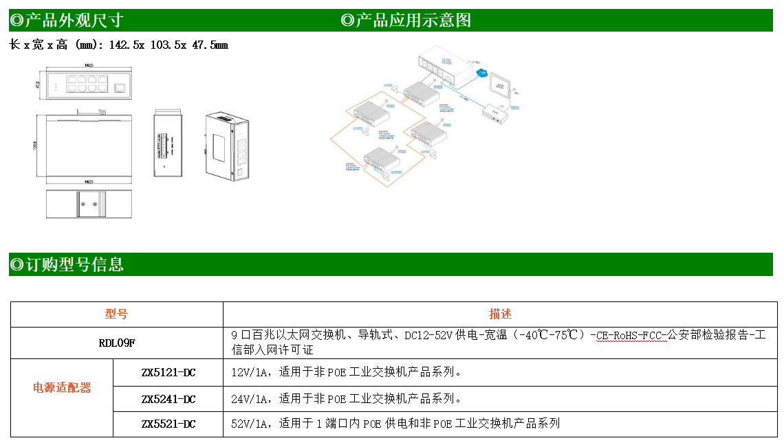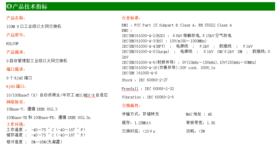 9路百兆電口工業(yè)級以太網(wǎng)交換機(jī),支持9個10Base-T/100Base-TX電口。產(chǎn)品符合FCC、CE、ROHS標(biāo)準(zhǔn)。RDL09F交換機(jī)具有-40℃~75℃的工作溫度,具有超強(qiáng)的堅固度能適應(yīng)各種嚴(yán)苛環(huán)境,也可以非常方便的安置在空間緊湊的控制箱中。導(dǎo)軌的安裝特性、寬溫操作及擁有IP40防護(hù)等級的外殼及LED指示燈,使RDL09F成為一個即插即用的工業(yè)級設(shè)備,為用戶的以太網(wǎng)設(shè)備聯(lián)網(wǎng)提供可靠、便捷的解決方案。