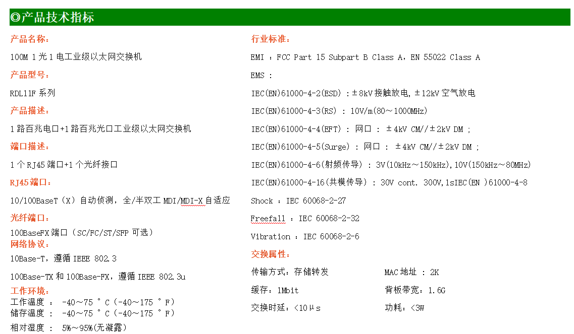1路百兆電口+1路百兆FX光口工業級以太網交換機,支持1個10Base-T/100Base-TX電口和1個100Base-X(SC/ST/FC)光口。產品符合FCC、CE、ROHS標準。RDL11F系列交換機具有-40℃~75℃的工作溫度,具有超強的堅固度能適應各種嚴苛環境,也可以非常方便的安置在空間緊湊的控制箱中。導軌的安裝特性、寬溫操作及擁有IP40防護等級的外殼及LED指示燈,使RDL11F成為一個即插即用的工業級設備,為用戶的以太網設備聯網提供可靠、便捷的解決方案。