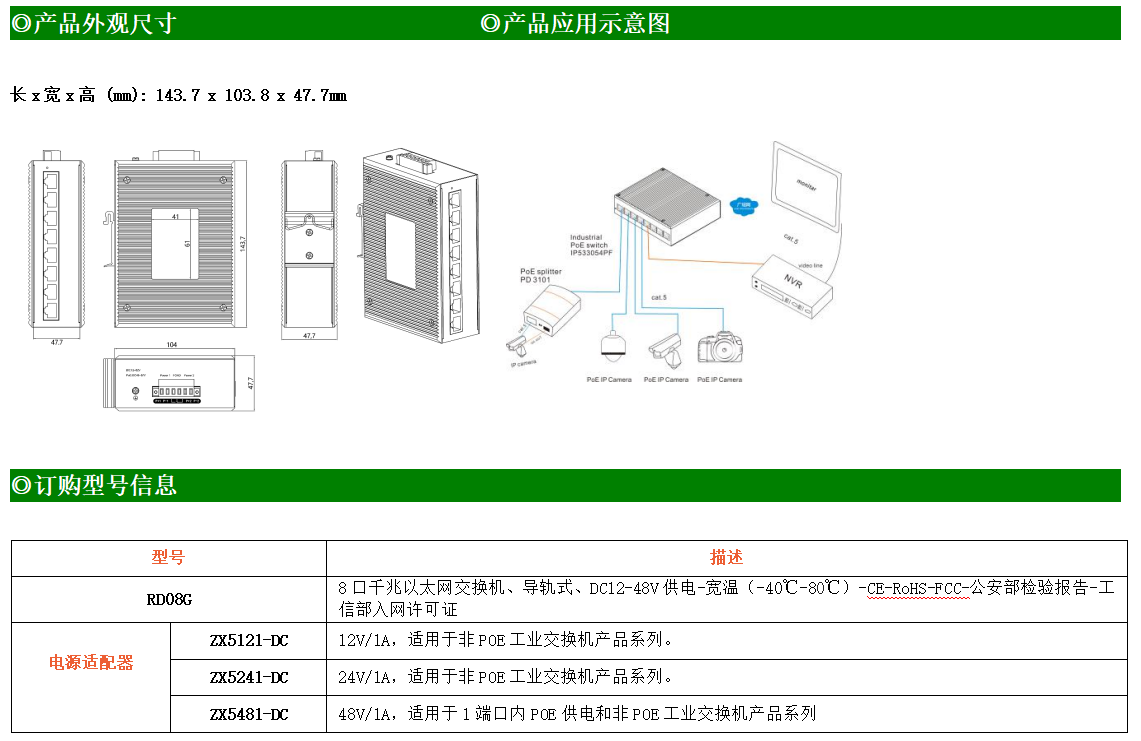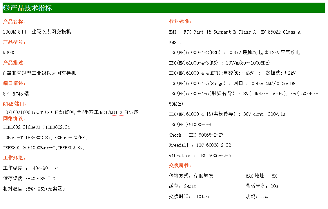 8路千兆電口工業級以太網交換機,支持8個10Base-T/100Base-T/1000Base-TX電口。產品符合FCC、CE、ROHS標準。RD08G交換機具有-40℃~80℃的工作溫度,具有超強的堅固度能適應各種嚴苛環境,也可以非常方便的安置在空間緊湊的控制箱中。導軌的安裝特性、寬溫操作及擁有IP40防護等級的外殼及LED指示燈,使RD08G成為一個即插即用的工業級設備,為用戶的以太網設備聯網提供可靠、便捷的解決方案。