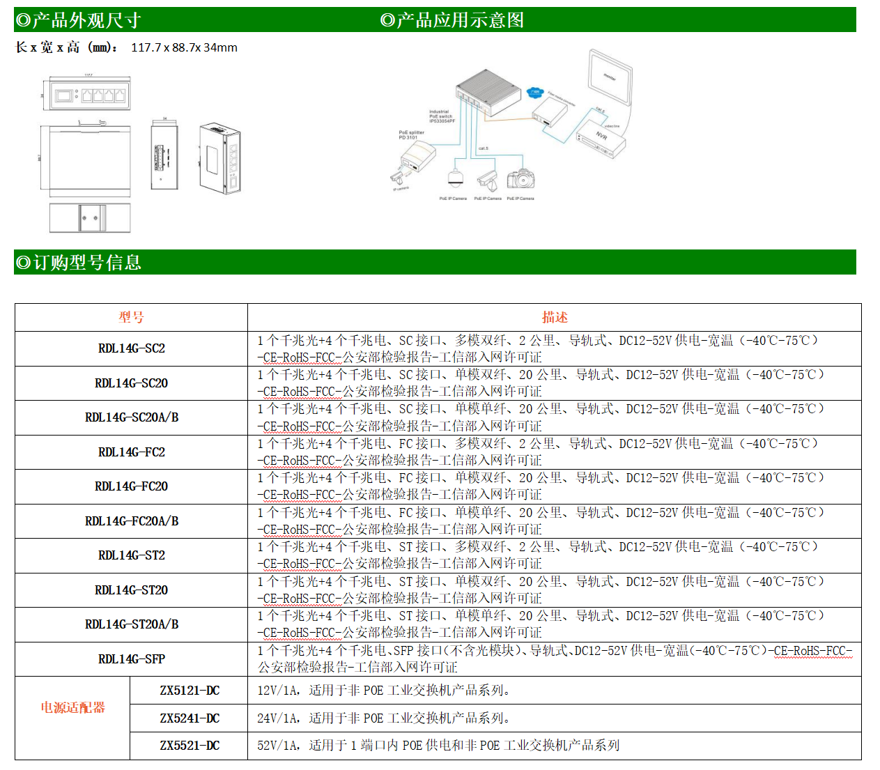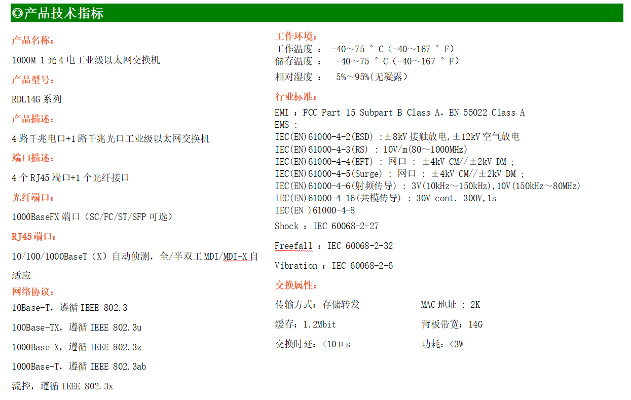 4路千兆電口+1路千兆FX光口工業(yè)級以太網(wǎng)交換機(jī),支持4個(gè)100Base-T/1000Base-TX電口和1個(gè)1000Base-X光口。產(chǎn)品符合FCC、CE、ROHS標(biāo)準(zhǔn)。RDL14G系列交換機(jī)具有-40℃~75℃的工作溫度,具有超強(qiáng)的堅(jiān)固度能適應(yīng)各種嚴(yán)苛環(huán)境,也可以非常方便的安置在空間緊湊的控制箱中。導(dǎo)軌的安裝特性、寬溫操作及擁有IP40防護(hù)等級的外殼及LED指示燈,使RDL14G系列成為一個(gè)即插即用的工業(yè)級設(shè)備,為用戶的以太網(wǎng)設(shè)備聯(lián)網(wǎng)提供可靠、便捷的解決方案。