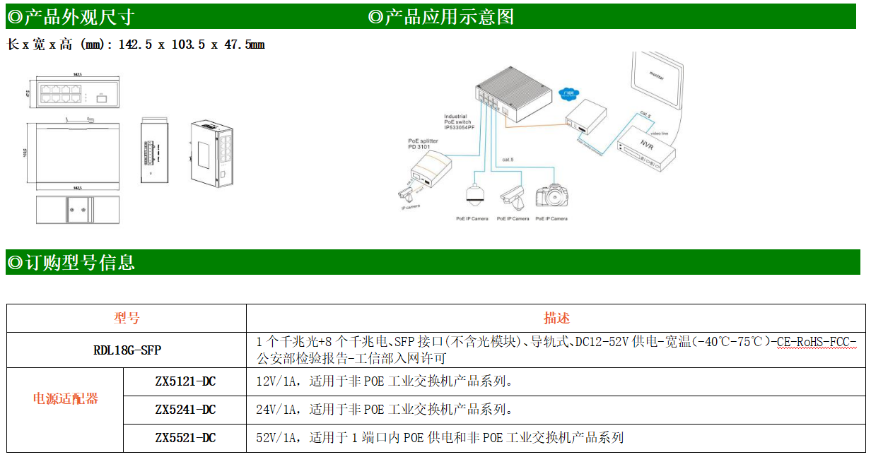 8路千兆電口+1路千兆FX光口工業級以太網交換機,支持8個100Base-T/1000Base-TX電口和1個1000Base-X光口。產品符合FCC、CE、ROHS標準。RDL18G系列交換機具有-40℃~75℃的工作溫度,具有超強的堅固度能適應各種嚴苛環境,也可以非常方便的安置在空間緊湊的控制箱中。導軌的安裝特性、寬溫操作及擁有IP40防護等級的外殼及LED指示燈,使RDL18G系列成為一個即插即用的工業級設備,為用戶的以太網設備聯網提供可靠、便捷的解決方案。