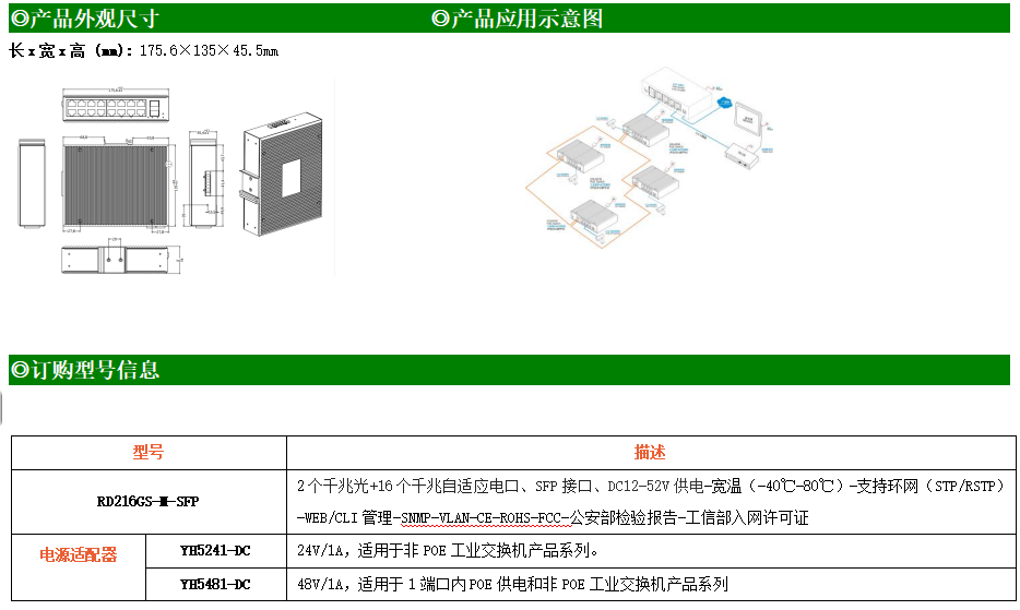RD216GS-M是網(wǎng)管型工業(yè)以太網(wǎng)交換機(jī),產(chǎn)品符合FCC、CE、RoHS標(biāo)準(zhǔn)。支持2個(gè)千兆光口和16個(gè)千兆電口;支持工業(yè)現(xiàn)場(chǎng)所需的以太網(wǎng)二層協(xié)議,保證通信網(wǎng)絡(luò)的穩(wěn)定性;該系列交換機(jī)采用低功耗、無風(fēng)扇設(shè)計(jì),確保無噪聲干擾,同時(shí)支持-40~80℃工作溫度和良好的EMC電磁兼容性能,保證在惡劣的工業(yè)環(huán)境中保持穩(wěn)定的工作,為工廠自動(dòng)化,智能交通,視頻監(jiān)控等工業(yè)應(yīng)用領(lǐng)域組建快速穩(wěn)定的網(wǎng)絡(luò)終端接入網(wǎng)絡(luò)提供安全可靠的解決方案。