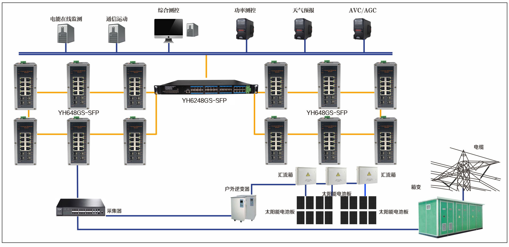 宇航在光伏發電站監控系統解決方案中采用了YH6248GS-SFP,YH648GS-SFP經數據采集,網絡傳輸,中心監控,以及使用端口匯聚實現上傳至站控制層的鏈接冗余。核心機房由宇航工業以太網交換機YH6248GS-SFP組成,YH6248GS-SFP匯聚多個環網數據流量。由YH648GS-SFP工業以太網交換機組成多個千兆冗余環網組成冗余協議,每個環網通過物理相隔離,提高網絡的安全性,保障了網絡的無憂切換。